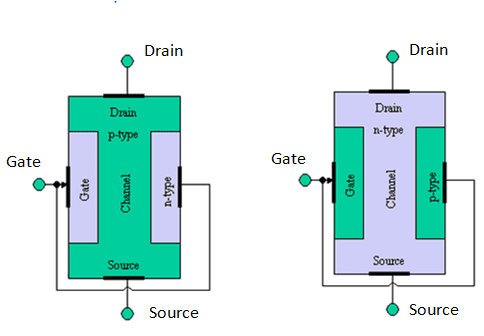 O transistor de efeito de campo também é chamado de unipolar, porque usa somente elétrons ou lacunas (espaços vazios sem elétrons, portanto, são cargas positivas) para a circulação de corrente dentro do dispositivo. Enquanto o transistor bipolar de junção (BJT) usa ambos. No JFET, a corrente flui somente pelo substrato e é controlada pela tensão no terminal da porta. Nas junções p-n, existe uma região de depleção, como na junção p-n do diodo.