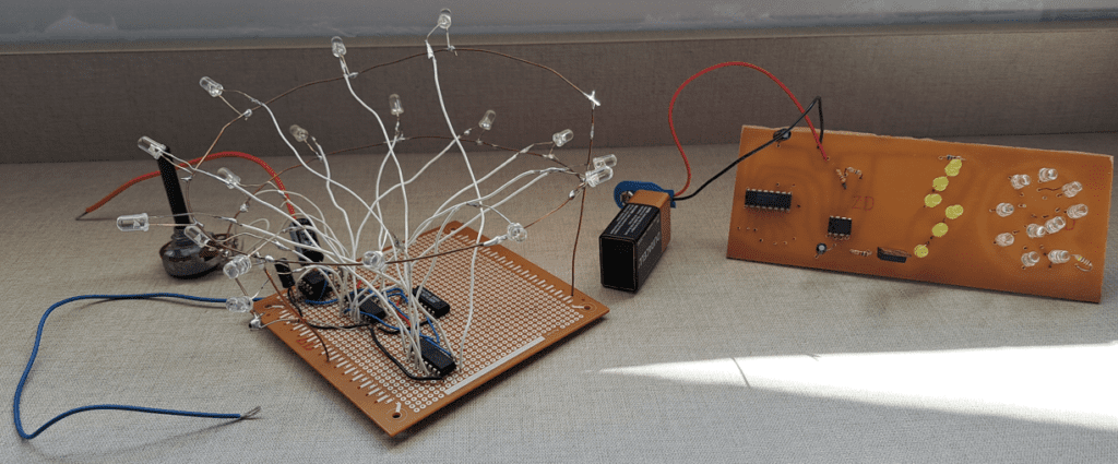 Neste projeto, dois chips 4017 são usados para controlar 17 LEDs, visto que com apenas um, só dá para controlar no máximo 10 LEDs. Um astável 555, cuja frequência pode ser controlada por um potenciômetro, faz o sinal de clock para o 4017.