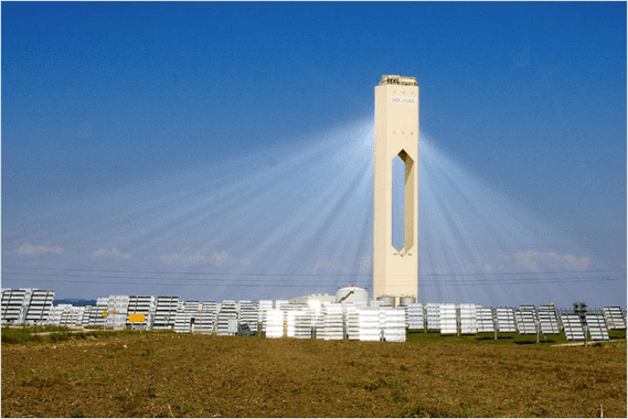 Many flat mirrors in ground called heliostats reflect sunlight and concentrate light in a solar tower’s receiver.