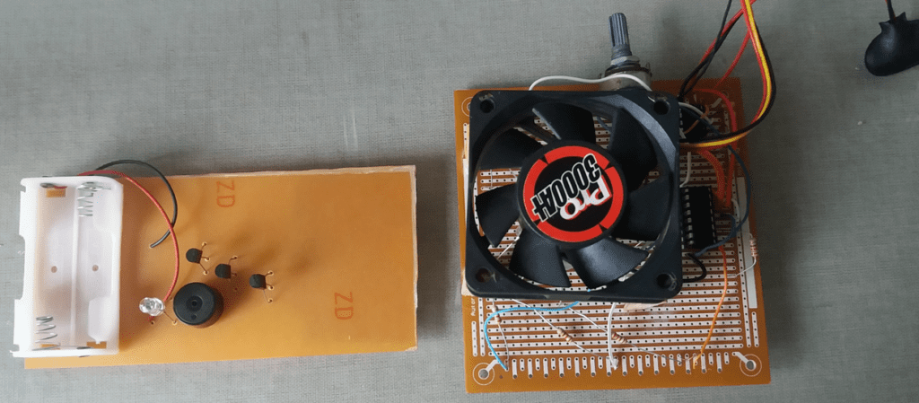 This circuit is very similar to the LED chaser, shown in the post about 4017. The differences are: the cooler is connected in parallel to power source, different values for astable, and a potentiometer to change 555’s signal frequency, consequently, the speed of activation sequence.