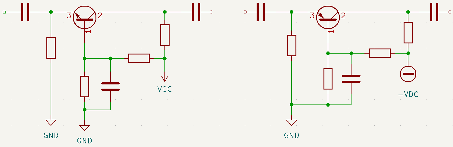 The used BJT is BC558, whose datasheets are on this link. Input impedance (Zi) is 50Ω again and supply voltage is -20V.