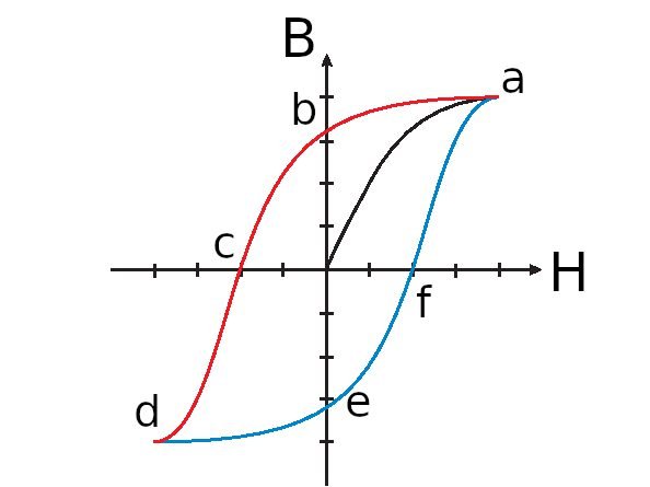 The magnetization process goes to point a, the latter is saturation point. Removing the external magnetic field, the material still has part of magnetic flux density (point b). Applying an external field in opposite direction, the material is demagnetized (point c) and the domains are pointed to opposite direction until saturation (point f). After removing the external field, material still keeps part of it (point e). Source: Electrical Academia.