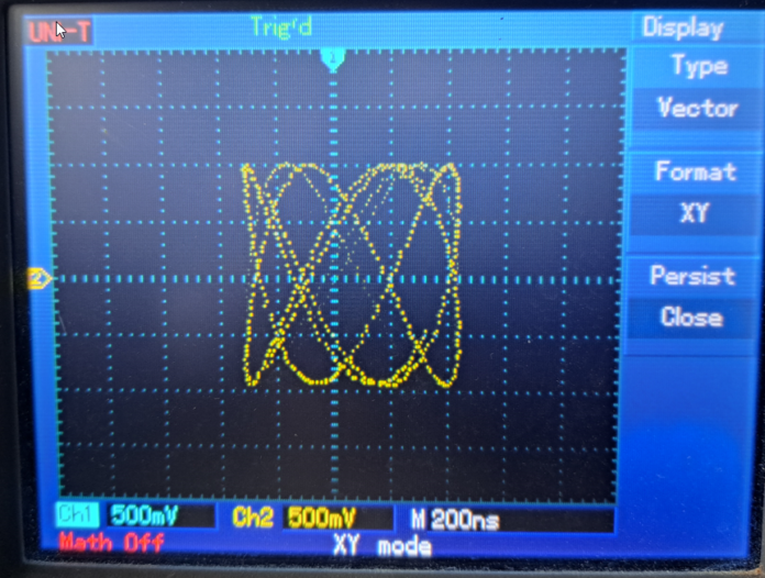 To generate Lissajous curves on the oscilloscope, simply change the display from time-based to XY mode. To create the Lissajous curves on my oscilloscope, I used my bench function generator and another generator I built based on the XR2206 chip.
