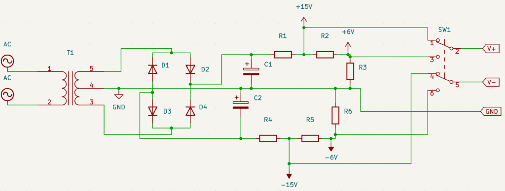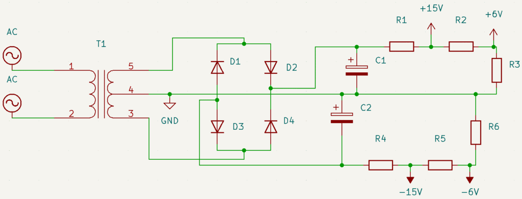 A transformer (T1) receives voltage from outlet for decrease it, a diode bridge (D1 to D4) transform alternate voltage in direct, then, electrolytic capacitors (C1 and C2) make DC signal more stable. Finally, resistors (R1 to R6) divide the voltage, to produce voltages to approximately ±15V and ±6V.