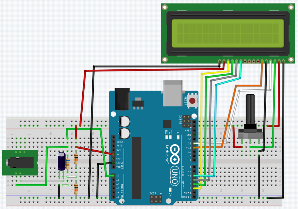 It’s appropriated to use the commercial value of 33Ω. R1 and R2 resistors must be equal, so that the offset voltage can be 2.5V, in this way, there won’t be negative values on Arduino input. The arbitrarily chosen value for both was 10kΩ. The function of capacitor C is to transform the sinusoidal signal in a more linear one with a ripple. C’s value is 10μF.