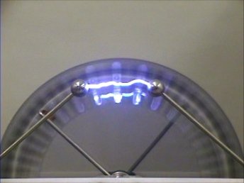 Finally, the large potential difference between the conductive spheres creates electric arcs.