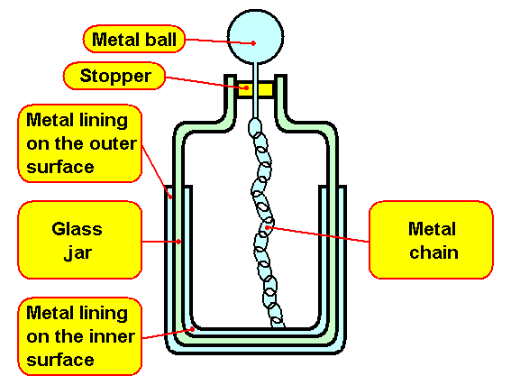 It’s a capacitor, as such, store electric charges. Consists in a jar made of dielectric material, such as glass, whose inner and outer walls have conductive layers. Receives charge due to a conductor ball linked to a conductor in contact with the inner wall, the outer wall must be grounded so that it can be charged with opposite sign of the inner wall.