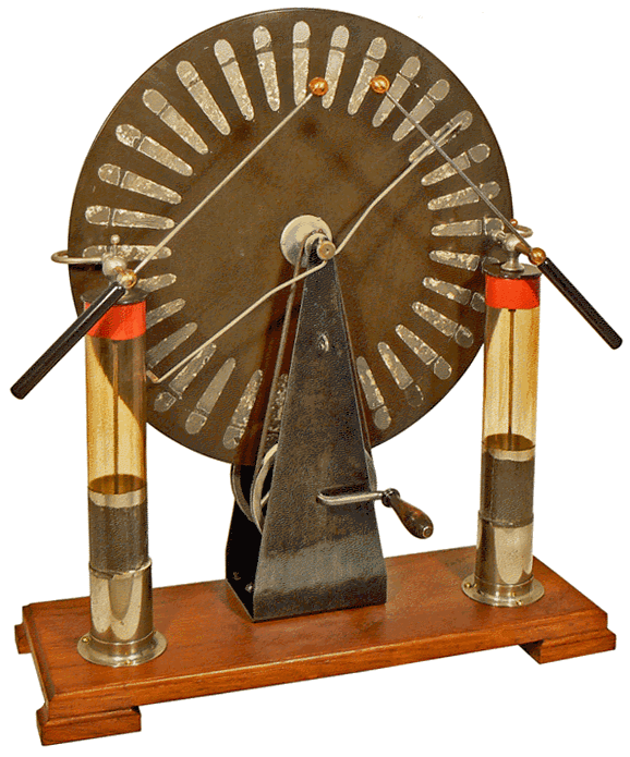 It was invented by the British engineer James Wimshurst in 1883, after three years of development. It has two disks with the same diameter and thickness, they spin in opposite directions on the same axle. The crank spins the base pulleys, which move they respective belts and pulleys with smaller diameter linked to the disks by an axle.