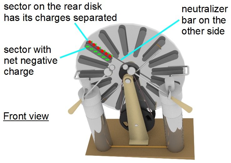 To start working, one of the metallic plates must have a small quantity of negative charge (excess of electrons) or positive charge (lack of electrons). To obtain this, it’s important that the air isn’t too humid. The electrically charged metal plate, or inductor, attracts opposite sign charges from plates on the other disk (induced) and repel charge with the same signal. This is the electrostatic induction.